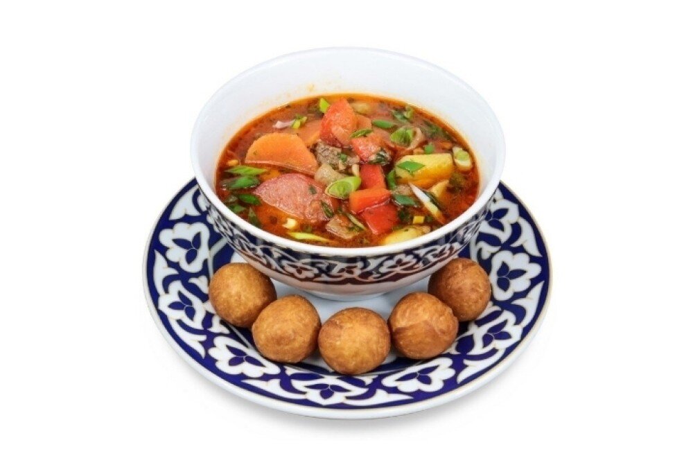 густой среднеазиатский суп с бараниной, овощами и зеленью, подается с баурсаками