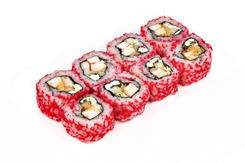 Крабовое мясо, пекинская капуста, сыр сливочный, соус спайси, икра тобико, листья нори, рис (8 шт)