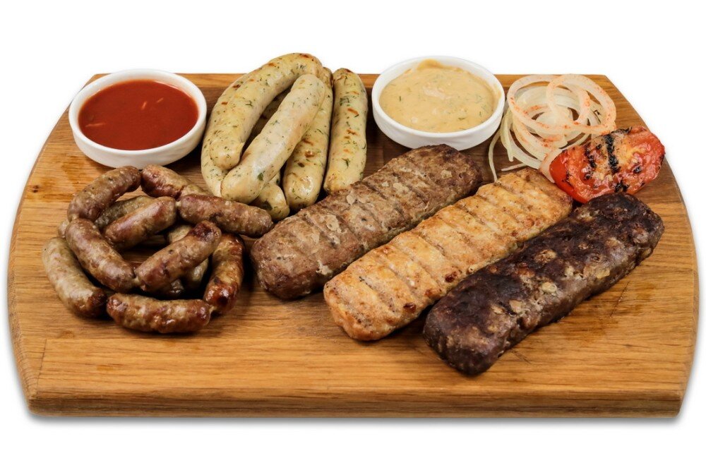 Ассорти из 3-х видов кебабов и 2-х видов домашних колбасок, подается с 2-мя видами соусов