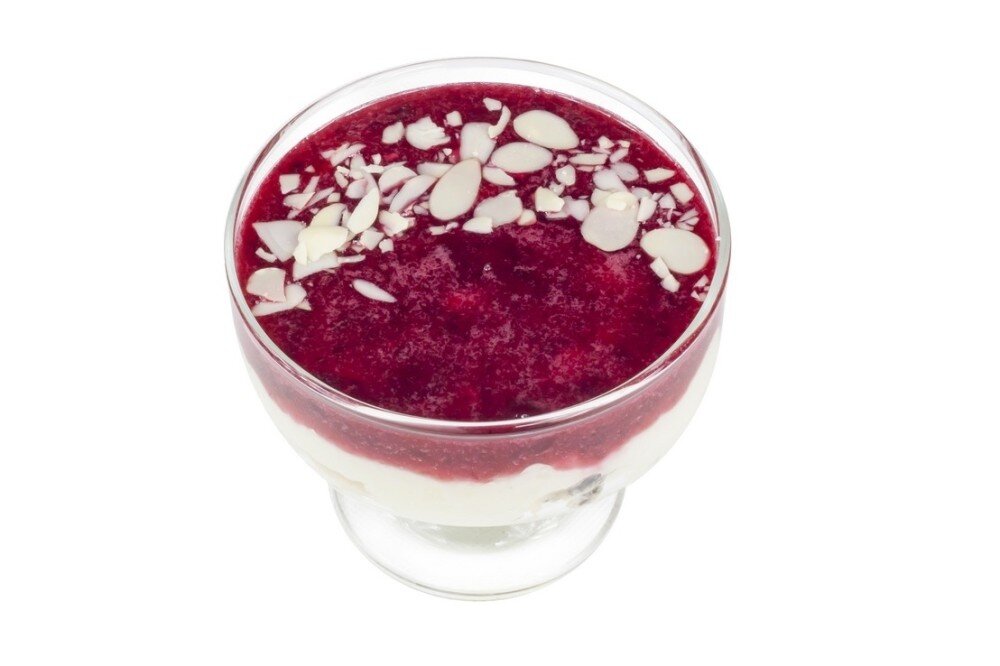 Творожно-сырный десерт с ягодным соусом и миндалем