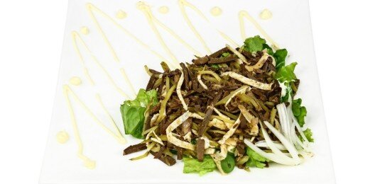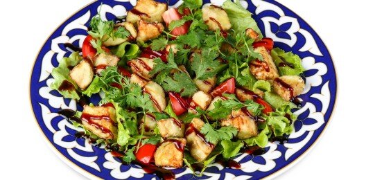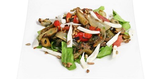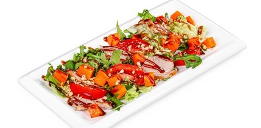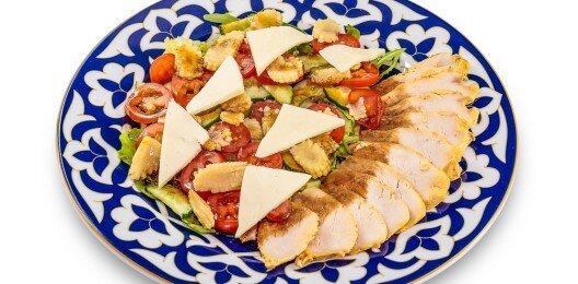 Индейка гриль, баклажаны, цукини, помидоры, зелень, соус кимчи с чесноком, кунжут