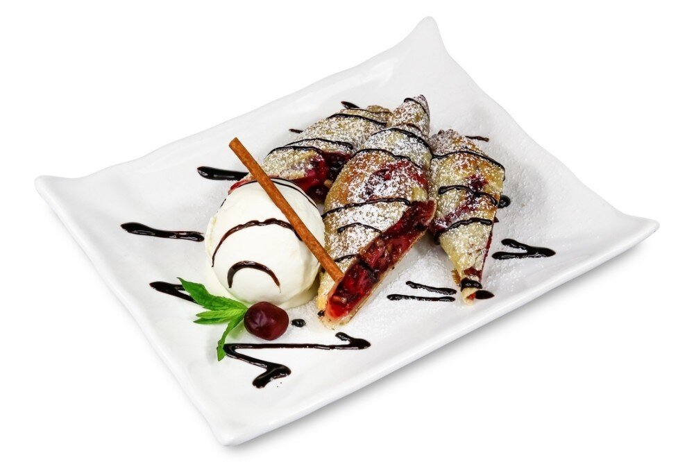 из слоеного теста подается с шариком джелато и шоколадным соусом
