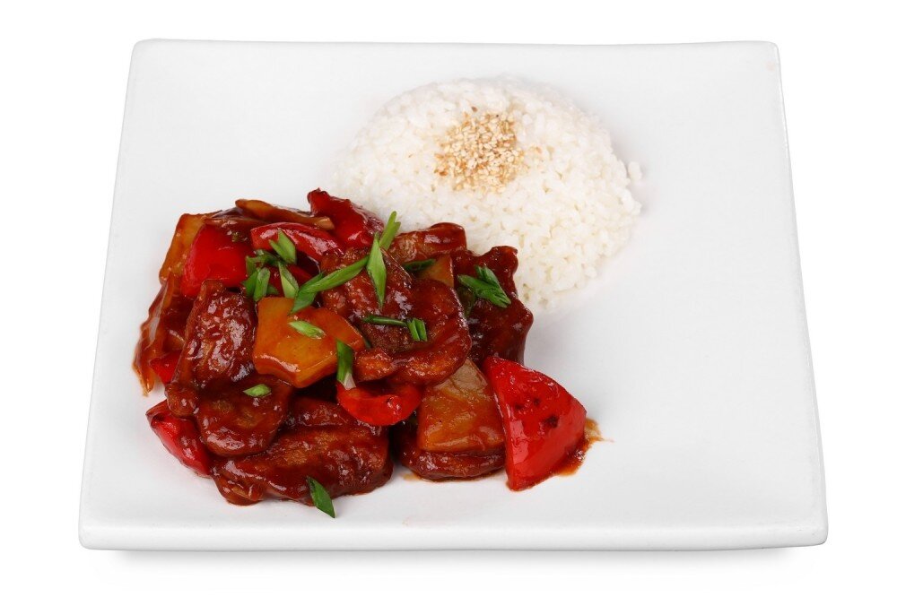 ананасы, лук, болгарский перец, зеленый лук, кунжут, подается с рисом