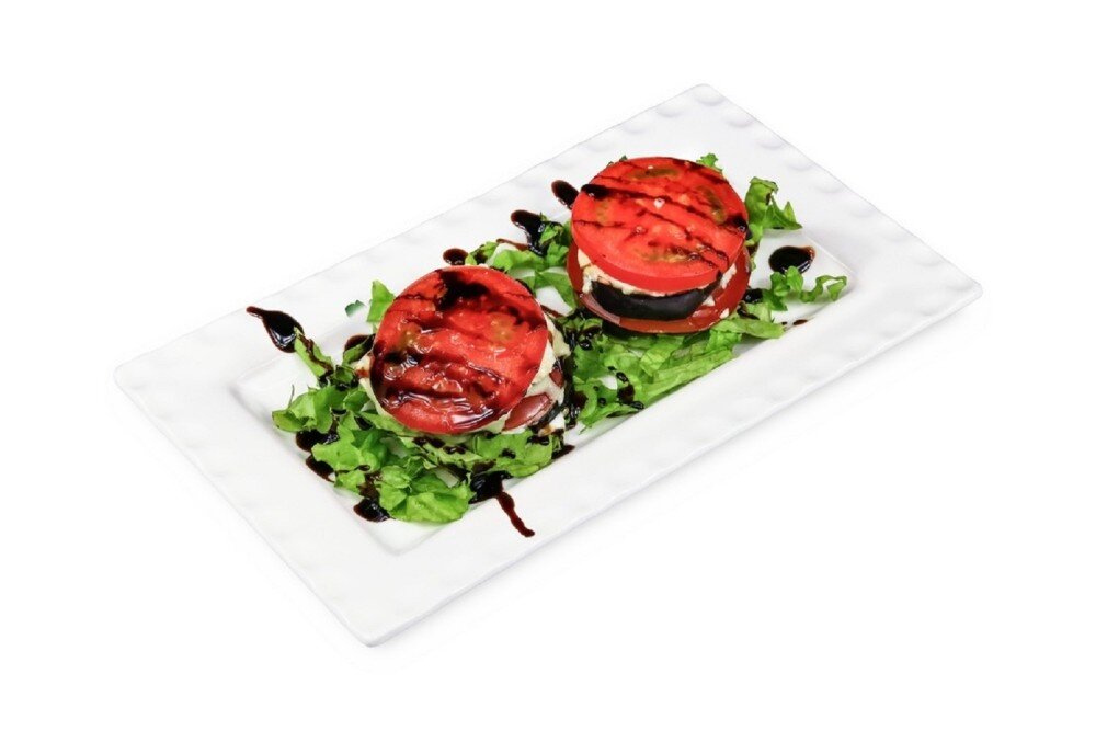 Баклажаны, грузинский сыр, сулугуни, майонез, крем бальзамико, лист салата
