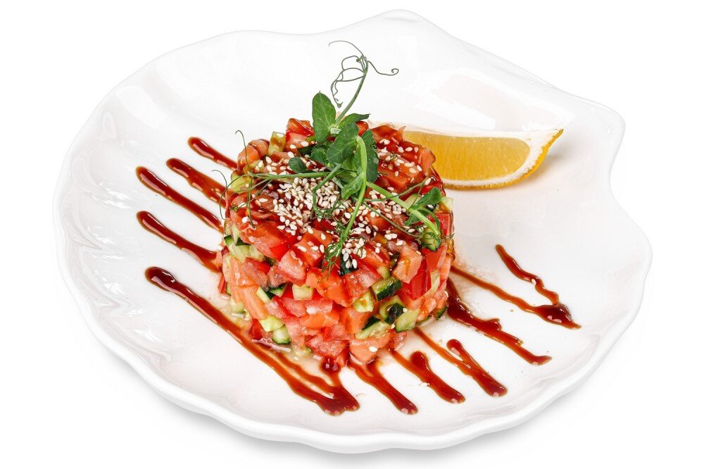 огурцы, помидоры, соус унаги, лимон, кунжут