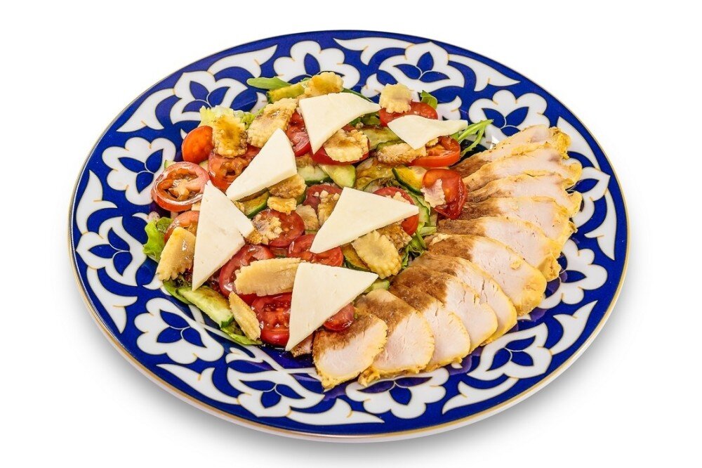 Цыпленок, грибы, сыр сулугуни, кукуруза в початках, огурцы, помидоры черри с соевым соусом