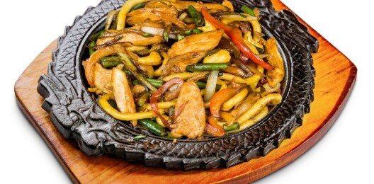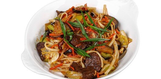 Грибы шиитаке, лук, морковь, пекинская капуста, соусы чили и устричный, кунжут, зеленый лук, лимон