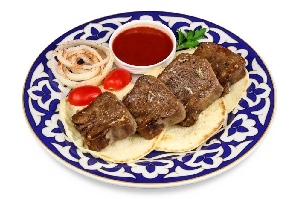 Подается с лавашем, луком и шашлычным соусом