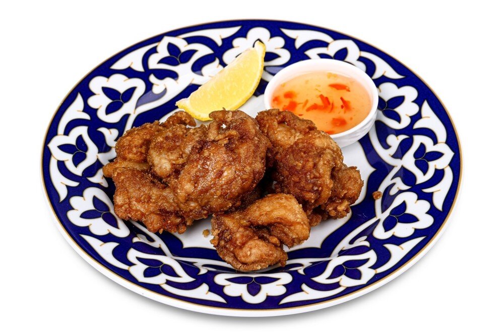 маринованные кусочки куриной мякоти, обжаренные во фритюре, подаются с лимоном и соусом "сладкий чили"