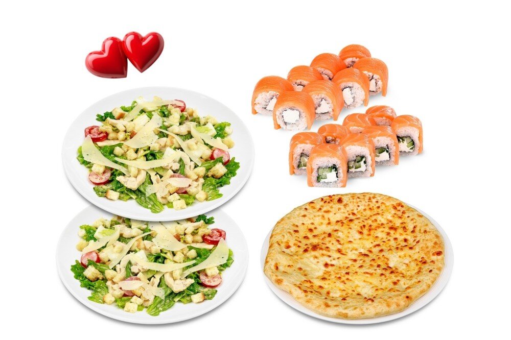 2 порции салата "Цезарь" с курицей, Хачапури по-мегрельски, роолы "Филадельфия", роллы "Киото", соевый соус, имбирь, васаби