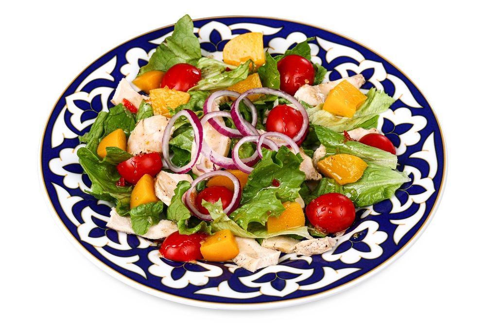 запеченное куриное филе, персики, помидоры, красный лук, лист салата, масло, соус чили сладкий