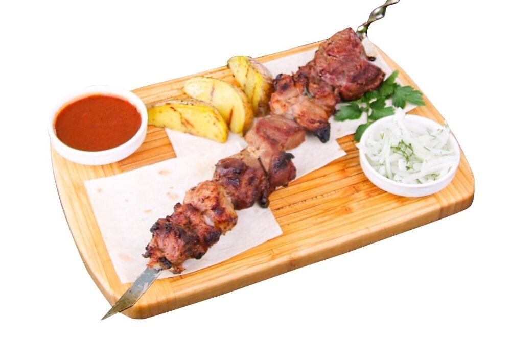 подается с лавашем, картофелем гриль, маринованным луком и шашлычным соусом