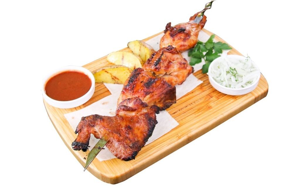 подается с лавашем, картофелем гриль, маринованным луком и шашлычным соусом