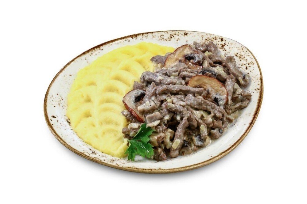 С шампиньонами и луком в сливочном соусе, подается с картофельным пюре