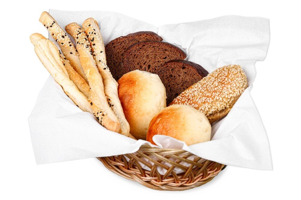 Хлеб ржано-пшеничный и черный, булочка, хлебные палочки с кунжутом