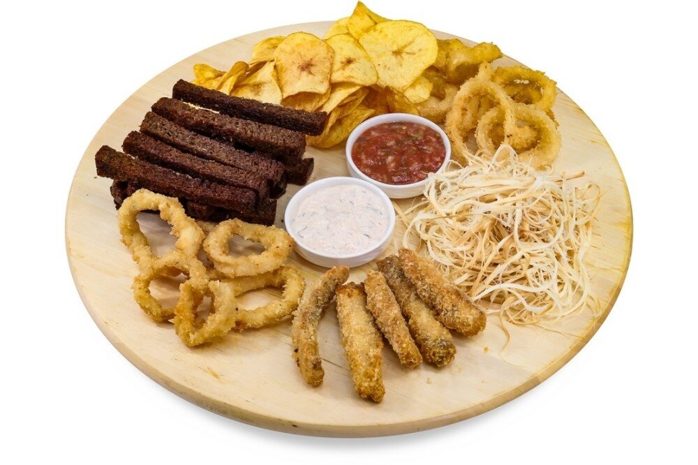 Кальмары и креветки темпура, мойва на шпажках, лук. кольца, домаш.чипсы, соусы сметанный и сальса