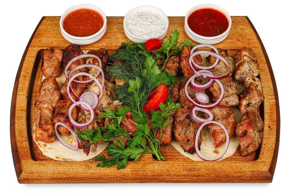 4 вида шашлыка (утка, свинина, барнанина, курица), лепешки, помиидоры, красный лук, зелень, соусы сацебели, ткемали и цахтон