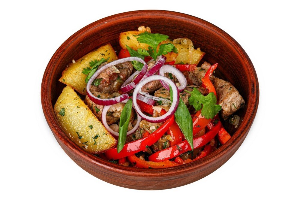 жареное мясо, картофель, болгарский перец, лук, чеснок, зелень, специи