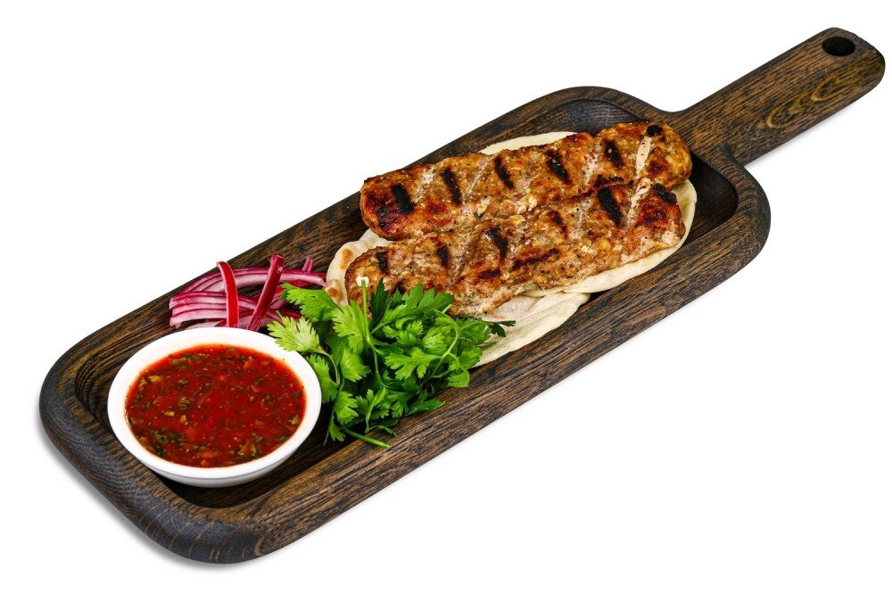 подается с лепешками, красным луком, зеленью и соусом сацебели