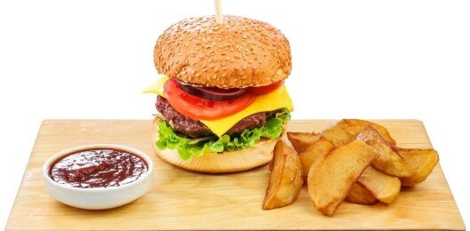 говядина, сыр чеддер, огурцы маринованные, помидоры, красный лук, лист салата, горчичный соус, соус барбекю, обжаренный картофель