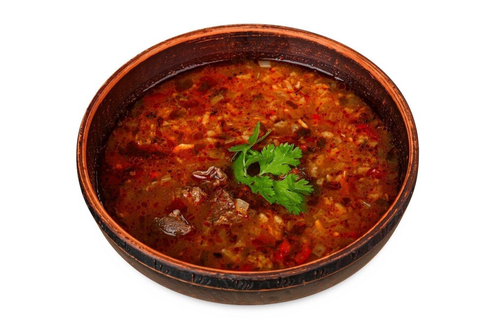томатный суп с рисом, специями, чесноком, соусом ткемали и зеленью