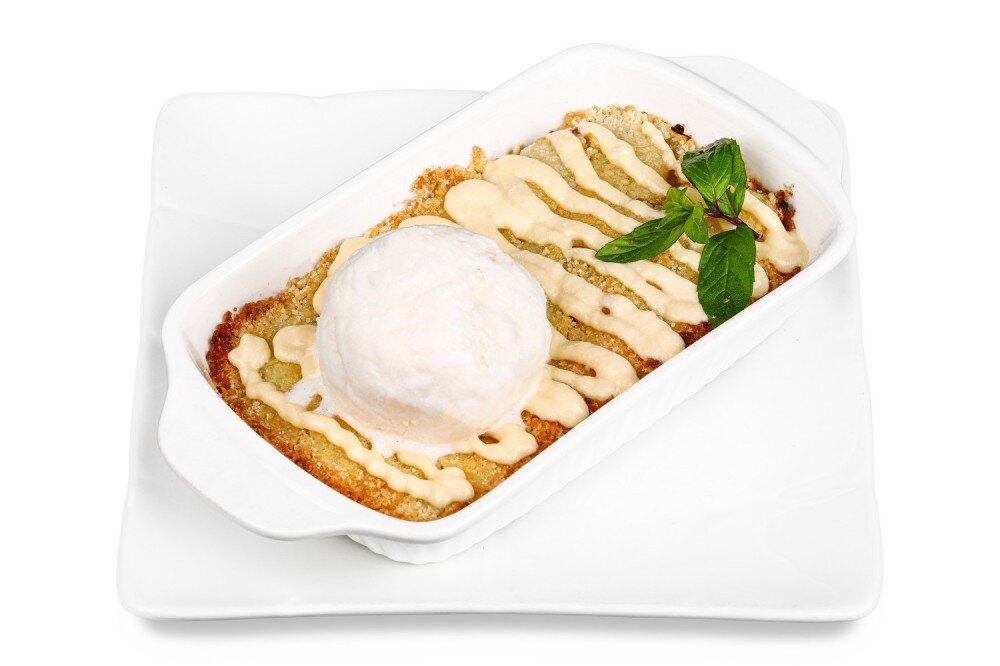 десерт из запеченных яблок с песочной крошкой, с английским кремом и шариком джелато