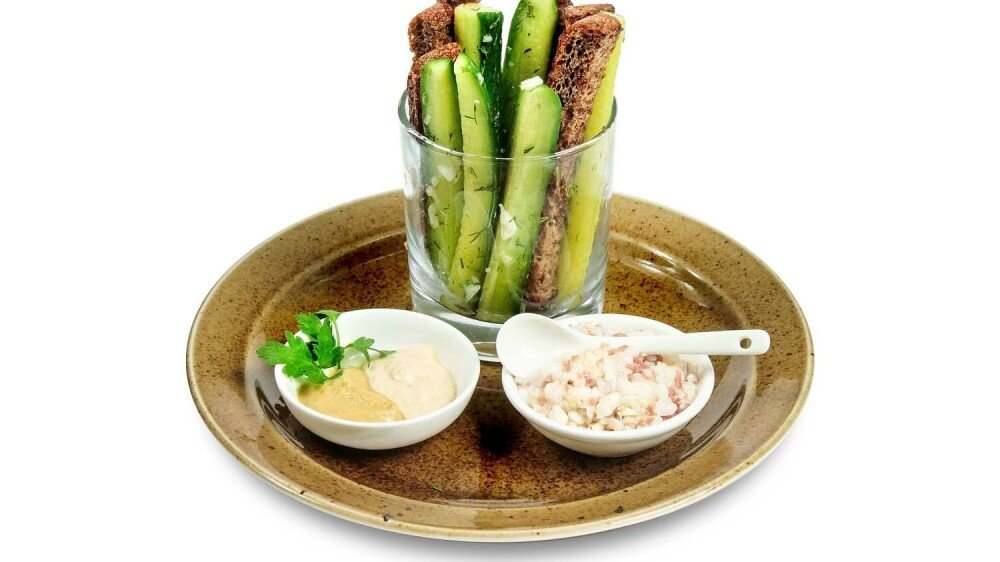 чесночные гренки, малосольные огурчики, сало с чесноком, хрен, горчица