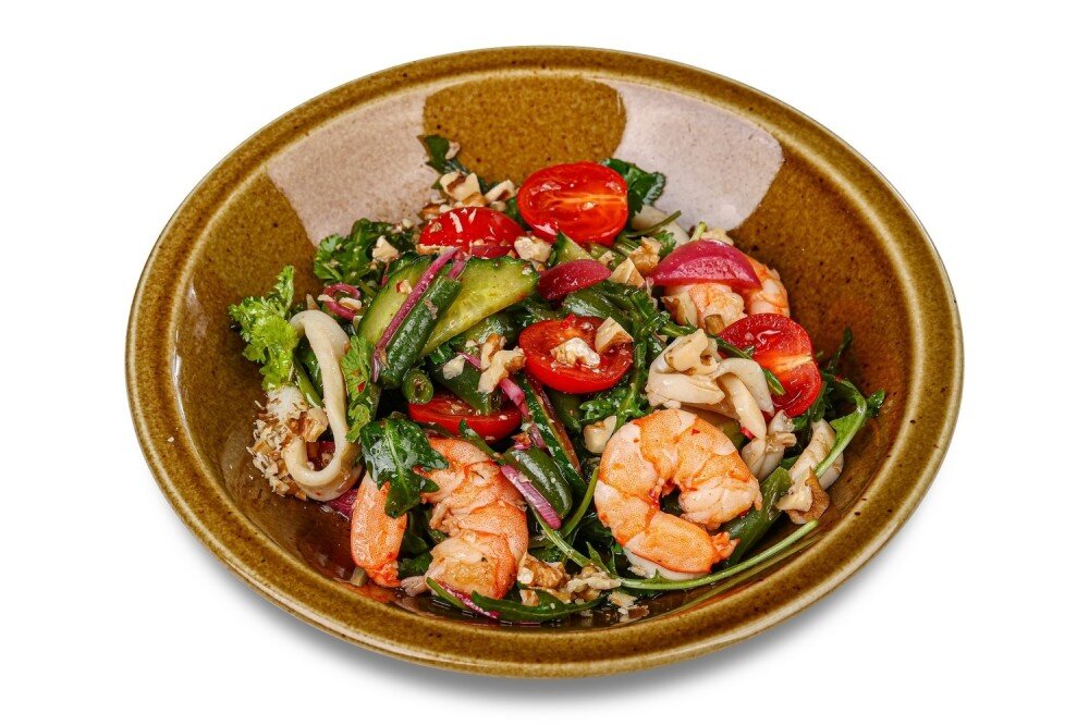 креветки, кальмары, огурцы, помидоры, стручковая фасоль, красный лук, кинза. руккола, грецкий орех, лимонно-масляная заправка, чеснок, имбирь, перец чили