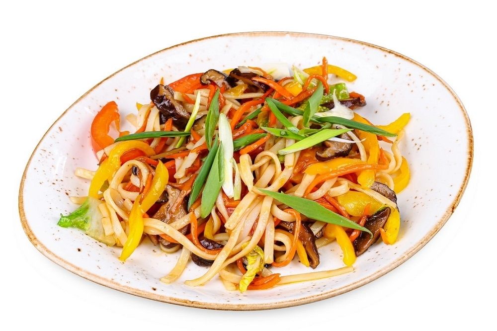 перец болгарский, помидоры, грибы, капуста пекинская, лук, соус терияки, соус чили, зелень