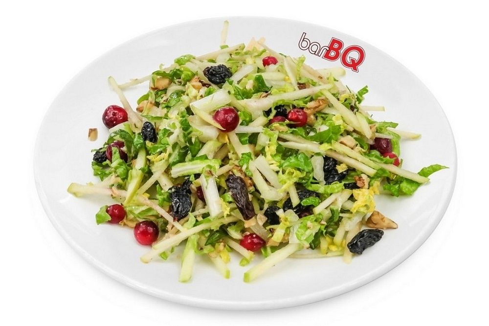 капуста пекинская, яблоко, изюм, клюква, орех грецкий, масло, сок лимона