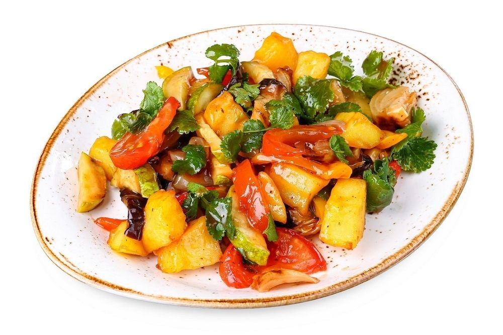запеченные баклажаны, цукини. перец, обжаренный картофель, лук, помидоры гриль, кинза, кисло-сладкий соус