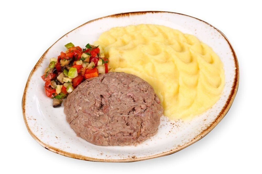 подается с картофельным пюре и салатом из запеченных овощей