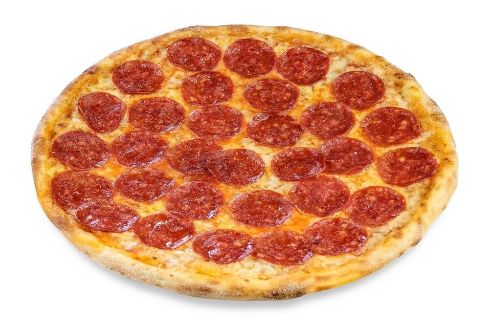 Остр. колбаса, крас. перец, томатный соус, орегано, моцарелла, лук