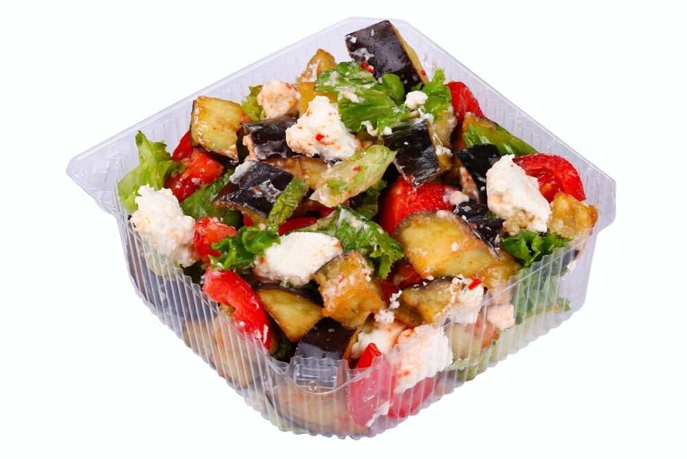 баклажаны жареные, помидоры, сыр сливочный, лист салата, соус сладкий чили