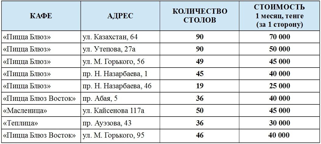 Каждый день сотни клиентов заказывают доставку блюд в сети кафе «Пицца Блюз» на дом и в офис. Ваши рекламные материалы (буклеты/флаера/листовки) могут быть вложены в пакет с заказом и доставлены клиенту прямо в руки. Стоимость услуги = количество буклетов * 10 тенге.